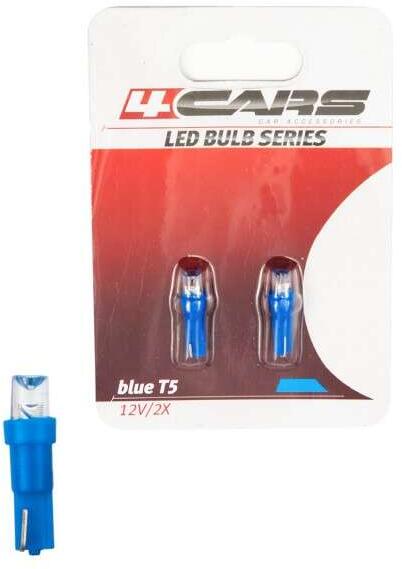4Cars T5 LED Izzó: 12V-os kék LED izzók autókba ? Két darab 12 voltos, 12 wattos T5 foglalatú kék LED izzó, széles szórással. Tökéletes választás autó belső világításához. Jellemzők:Típus: T5 W2x46d Feszültség: 12V Teljesítmény: 12W Szín: Kék szórt fény Mennyiség: 2 db Foglalat típusa: Műanyag T5 Fontos megjegyzés: Ezek a LED izzók kizárólag belső használatra alkalmasak. Külső használatuk nem legális, kivéve versenyeken, show-room-okban, off-road találkozókon és magánpályákon. Használat: Könnyen felszerelhető, a hagyományos izzók helyettesítésére alkalmas. Frissítse autójának világítását energiatakarékos és modern LED technológiával!