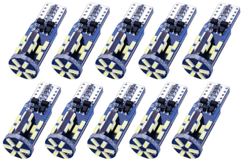 A legelterjedtebb autós LED foglalat a T10. Jellemzően a műszerfal , valamint visszajelző piktogrammok megvilágítására szolgál, valamint sokfelé használják az autóban: helyzetjelzőként , belső utastér világításként vagy rendszámtábla világításként. Adatok: Tápellátás: 12V-24V Foglalat: T10 / W5W LED-ek száma: 30db/izzó LED típusa: 4014SMD Színhőmérséklet: 6500K (hideg fehér) Fényáram: 500 lumen CANBUS támogatás Kiszerelés: 1csomag/10darab CANBUS