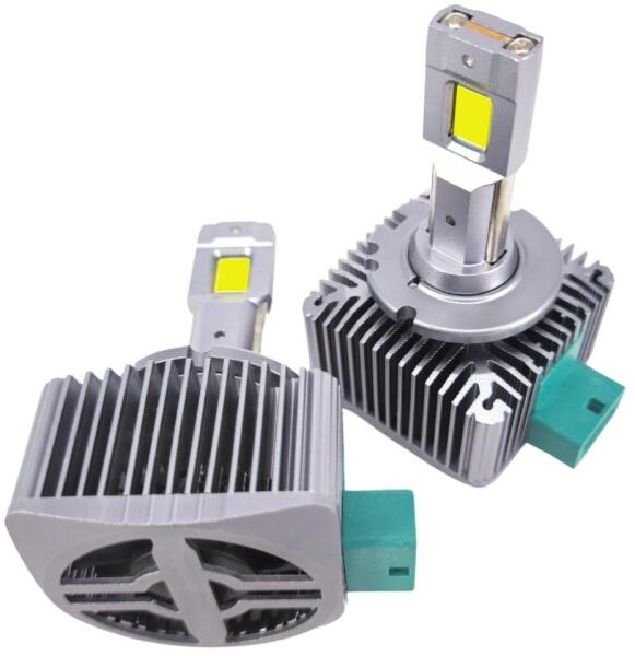 D3S foglalatú Xenon helyettesítő, 6000K színhőmérsékletű jégfehér LED izzó szett. Fényáram : 7200 lumen / db (sajnos sok helyen tévesen a 2db izzó értékét adják meg)  - Gyári D3S xenon izzóval megegyezik méretben és fókuszpont helyzetben is. - A LED izzó hőleadása jelentősen alacsonyabb, mint a xenon izzóé. Ezt biztosítja a 2 LED chip között húzódó réz hőelvezető mag, és a szélén lévő 2db hőelvezető szál.  A kiegészítő hűtési mechanizmus a LED chip belső részének védelmét szolgálja. - Könnyen beszerelhető a gyári izzó helyére, nem szükséges semmi átalakítás vagy adapter. Gyári csatlakozóra kell rákötni, ugyanúgy, mint egy hagyományos xenon izzót. - Kiváló minőségű, extra magas fényerejű  -  az izzó mindkét oldalán  2db   18  szegmenses  5084 CSP LED chip / izzó. - Bármelyik CANBUS -os autó rendszeréhez illeszkedik hibakód nélkül.   (Kivétel : KIA Sorento III) - 12V személyautó és 24V tehergépjárműbe is kompatibilis.   -A hőelvezetés miatt az egész ház fém + aktív belső ventilátoros hűtés a hosszú élettartamért.