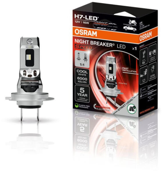 Engedélyezett OSRAM NIGHT BREAKER Speed H7 LED – A Jövő Világítása motorkerékpárokhoz! Az OSRAM NIGHT BREAKER LED SPEED H7 a legújabb megoldás, amellyel járműved világítását a legmodernebb LED technológiára frissítheted. Ez a LED csereizzó lehetővé teszi a tompított és távolsági fényszórók egyszerű és gyors átalakítását, további adapterek nélkül. Plug & Play változat. Az innovatív OSRAM elektronika és az 1:1 arányú kialakítás biztosítja a hagyományos halogén izzók egyszerű cseréjét. Főbb jellemzők: