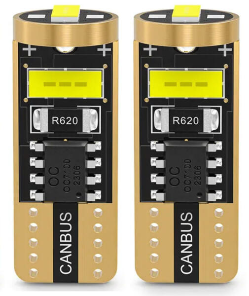 A legelterjedtebb autós LED foglalat a T10. Jellemzően a műszerfal , valamint visszajelző piktogrammok megvilágítására szolgál, valamint sokfelé használják az autóban: helyzetjelzőként , belső utastér világításként vagy rendszámtábla világításként. Adatok: Tápellátás: 12/24V Foglalat: T10 / W5W Teljesítmény: 1,8W LED-ek száma: 3db/izzó LED típusa: 2025 SMD Színhőmérséklet: 6500K (hideg fehér) Fényáram: 500 lumen CANBUS támogatás Kiszerelés: 1csomag/2darab