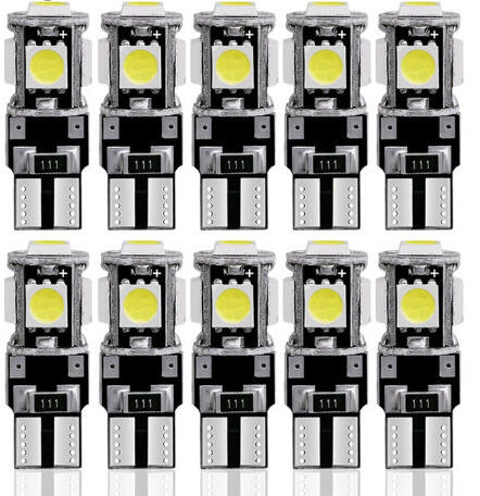 A legelterjedtebb autós LED foglalat a T10. Jellemzően a műszerfal , valamint visszajelző piktogrammok megvilágítására szolgál, valamint sokfelé használják az autóban: helyzetjelzőként , belső utastér világításként vagy rendszámtábla világításként. Adatok: Tápellátás: 12V Foglalat: T10 / W5W LED-ek száma: 5db/izzó LED típusa: 2025 SMD Színhőmérséklet: 6500K (hideg fehér) Fényáram: 500 lumen CANBUS támogatás Kiszerelés: 1csomag/10darab