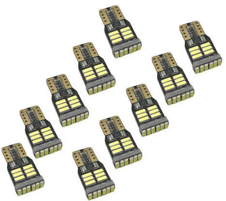 10db-os T10-18SMD - fehér - 12V A legelterjedtebb autós LED foglalat a T10. Jellemzően a műszerfal , valamint visszajelző piktogrammok megvilágítására szolgál, valamint sokfelé használják az autóban: helyzetjelzőként , belső utastér világításként vagy rendszámtábla világításként. Adatok: Színe: fehér Feszültség: 12V LED-ek száma: 18db/izzó LED típusa: 3018 SMD Fényáram: 210 lumen Színhőmérséklet: 5500K (hideg fehér) Kiszerelés: 1csomag/10db